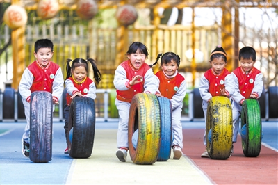 近日,浙江省湖州市长兴县画溪街道长桥中心幼儿园的小朋友们在玩“轮胎运球”游戏。当日,该园开展“趣味篮球 乐享成长”主题活动,组织孩子们参加花样篮球游戏。许斌华 摄 作者:许斌华 摄 《中国教育报》2021年12月25日第1版 版名:要闻