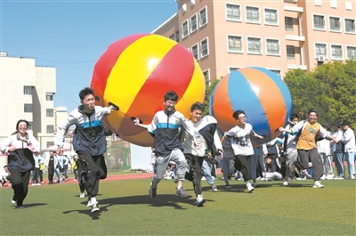 近日,安徽省淮北市第十二中学组织高三学生开展形式多样的集体“减压”活动。图为学生参加乾坤球减压游戏。万善朝 摄 作者:万善朝 摄 《中国教育报》2022年05月09日第1版 版名:要闻