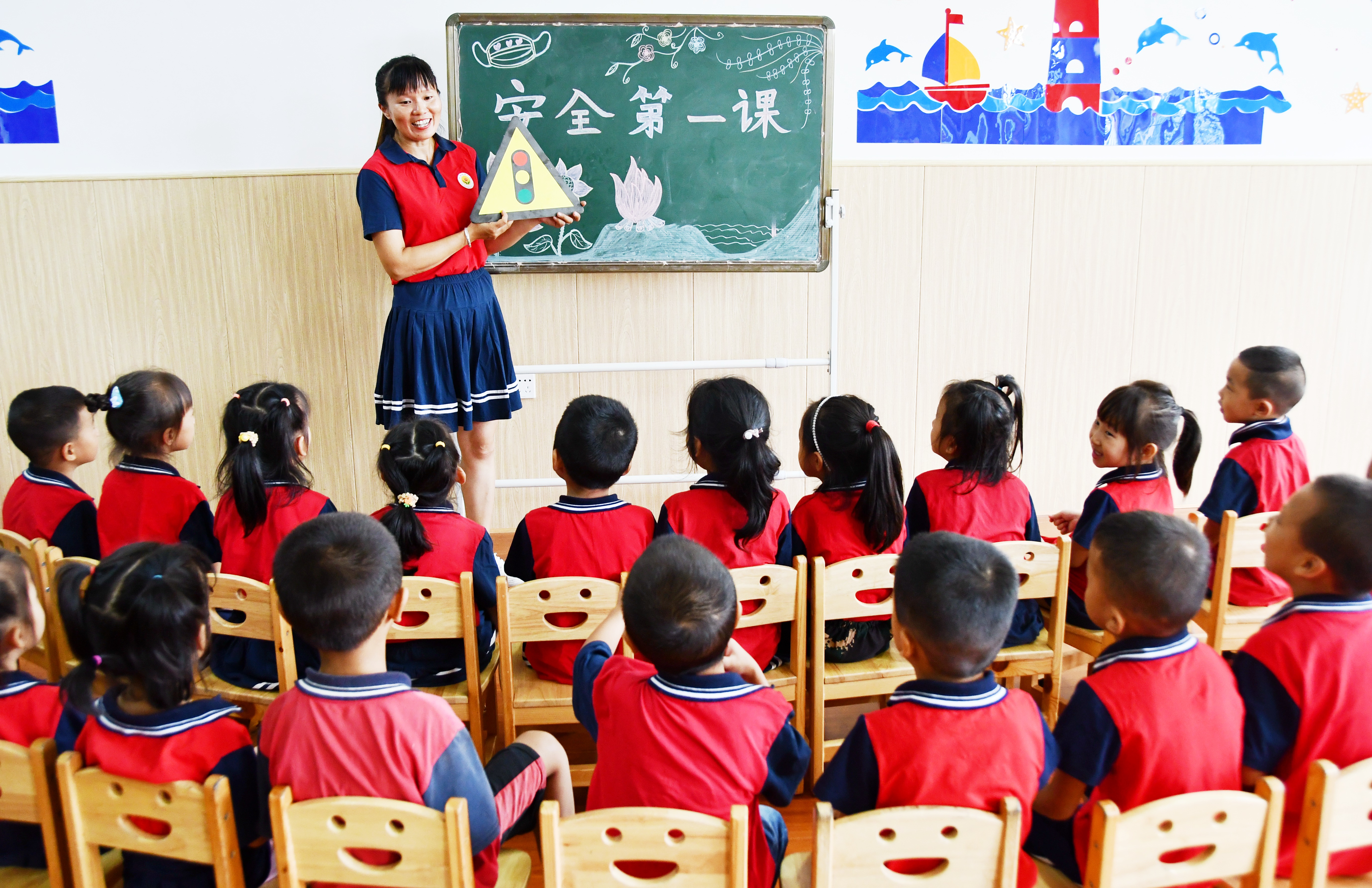 孩子们听老师讲交通安全知识。通讯员 田如瑞 摄 9月1日,湖南省永州市江永县潇浦镇红太阳幼儿园的孩子们听老师讲交通安全知识。近日,全国部分地区的中小学校、幼儿园开展“开学第一课”活动,讲解交通安全知识,培养孩子们的安全意识。中国教育报-中国教育新闻网通讯员 田如瑞 摄