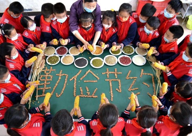 学生在老师的带领下,了解农粮种植的艰辛,学习节粮知识。 杨显有 摄 为迎接10月31日“世界勤俭日”,2022年10月25日,湖北省十堰市郧阳区柳陂镇中心小学开展“勤俭节约,从小做起”主题班会,老师结合时下秋收把“五谷杂粮”带进课堂,向学生们介绍各种农粮及种植的艰辛过程,学生搓玉米粒体验“粒粒皆辛苦”和劳动快乐,用杂粮拼“勤俭节约”字样,从小培养学生“节粮爱粮”的节俭意识,自觉践行“光盘行动”。通讯员 杨显有 摄 作者:杨显有